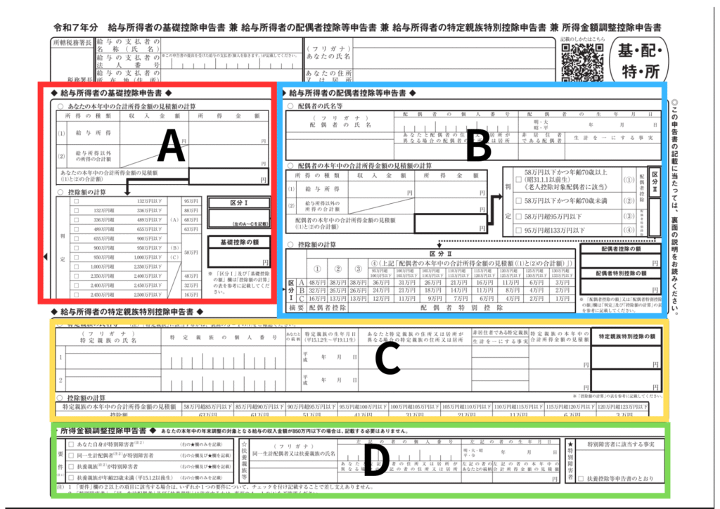 出典:国税庁「令和7年度 給与所得者の基礎控除申告書 兼 給与所得者の配偶者控除等申告書 兼 給与所得者の特定親族特別