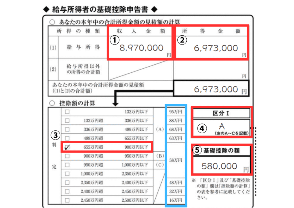 当てはまる金額に値する青い四角の部分の控除額を③に記載する