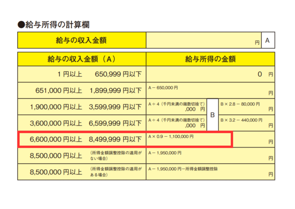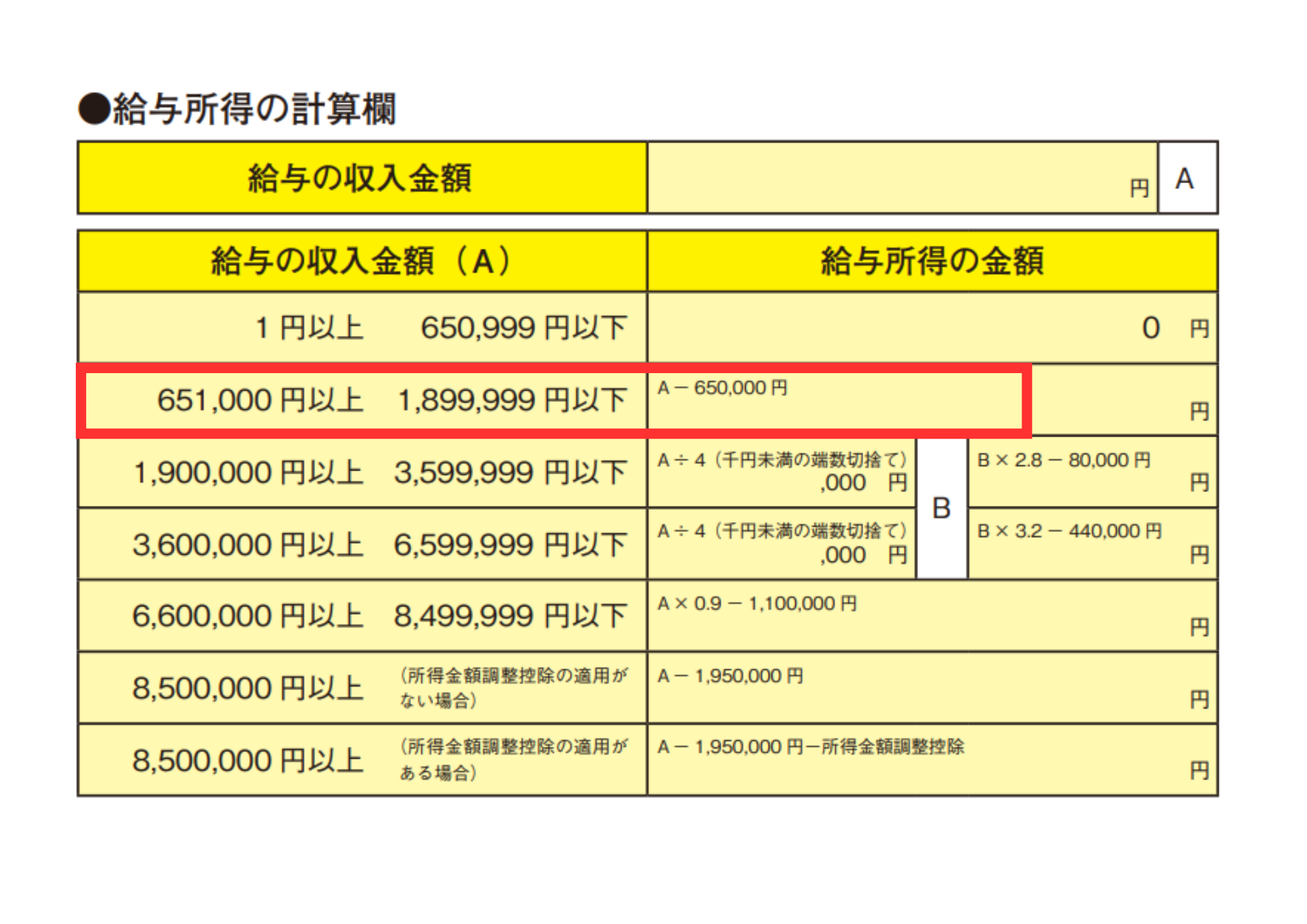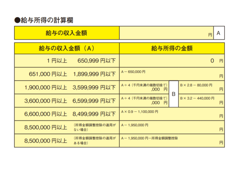 • 上の表をもとに給料所得金額を出す▶︎②に記載