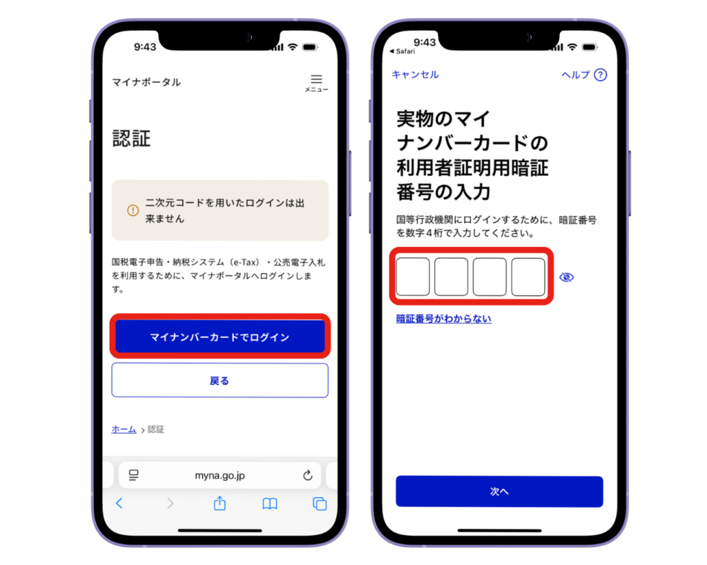 ②マイナンバーカードの4桁の暗証番号を入れる